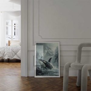 Discover the serene beauty of Scotland’s coast with this captivating wall print of an orca, gliding gracefully through its natural habitat.