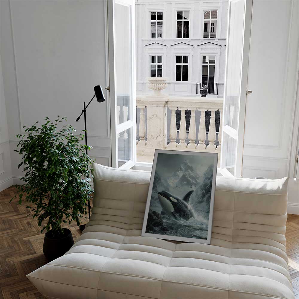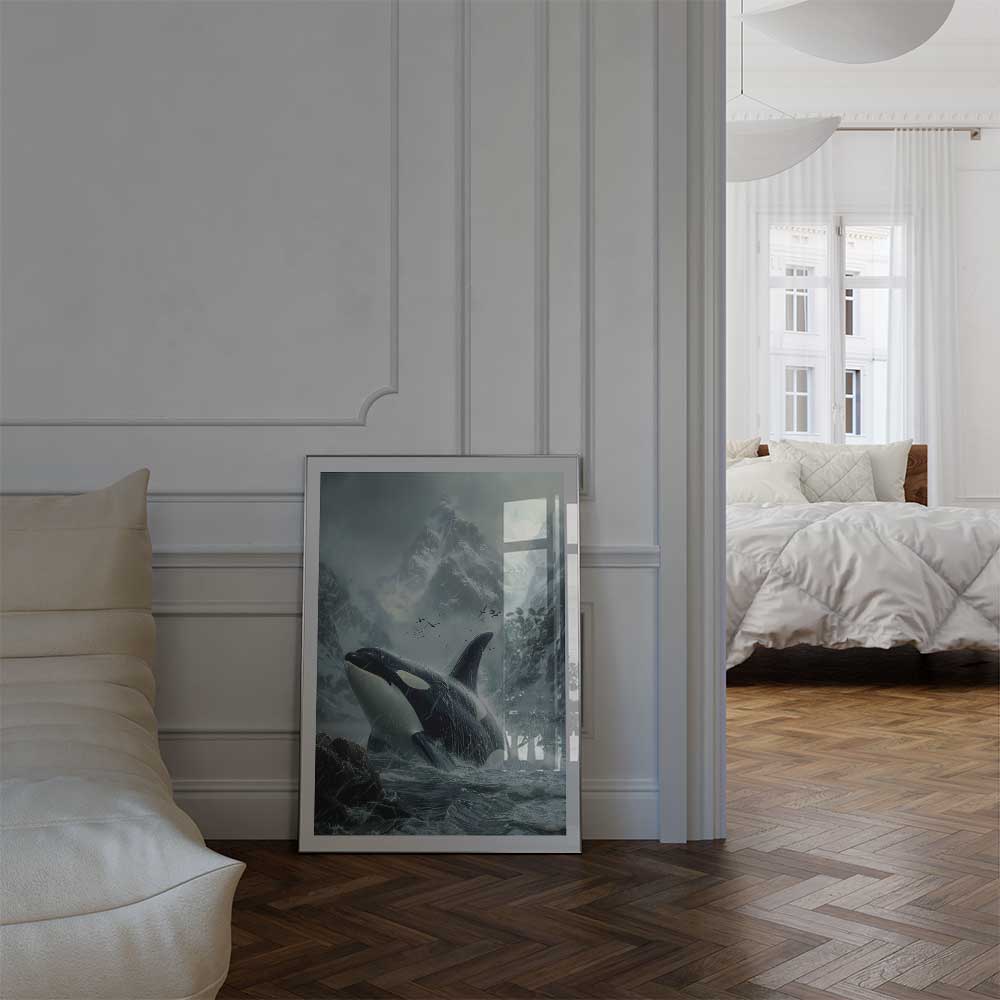 Discover the serene beauty of Scotland’s coast with this captivating wall print of an orca, gliding gracefully through its natural habitat.