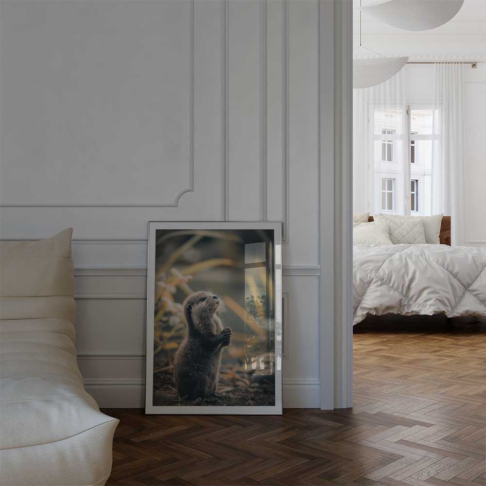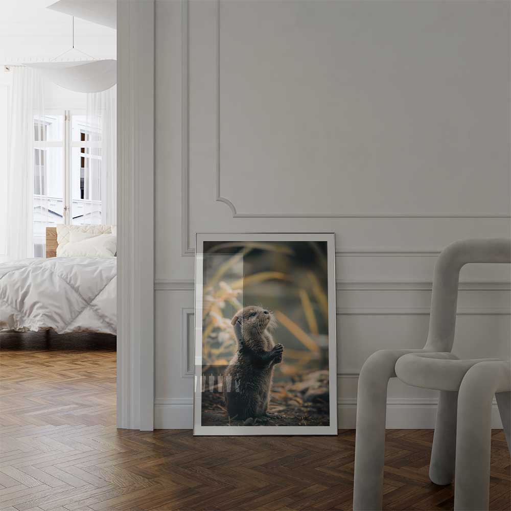 Capture the charm of the Scottish Highlands with this adorable wall print of a baby otter intrigued by its surroundings.