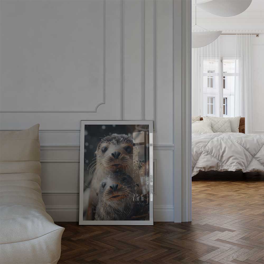 Explore the serene beauty of Scotland’s coast with this enchanting wall print of a seal and her pup, basking peacefully in its natural surroundings.