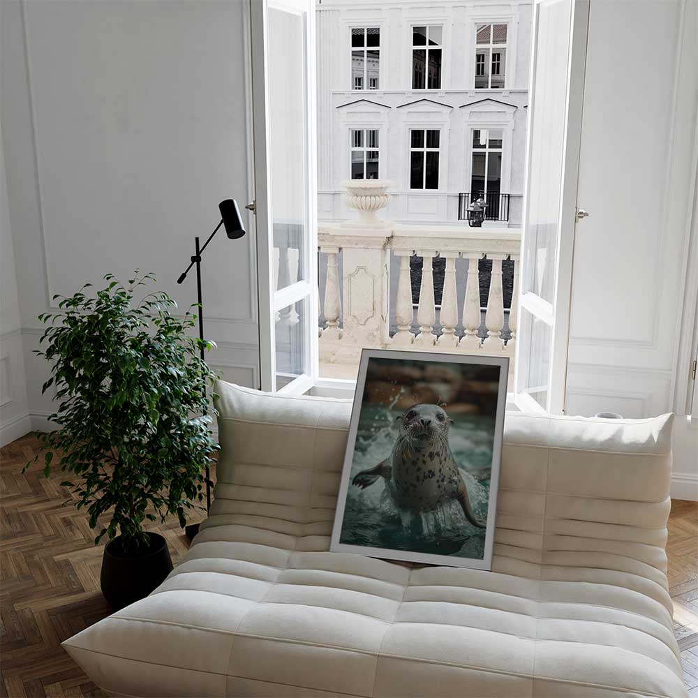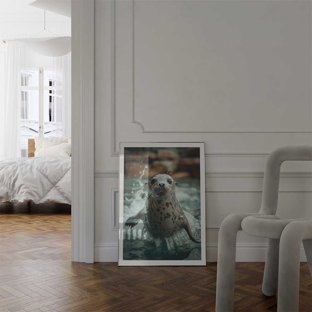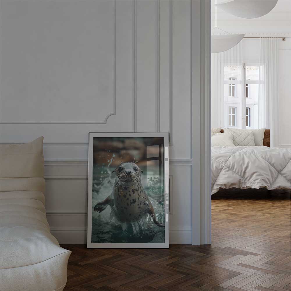Explore the serene beauty of Scotland’s coast with this enchanting wall print of a seal, swimming peacefully in its natural surroundings.