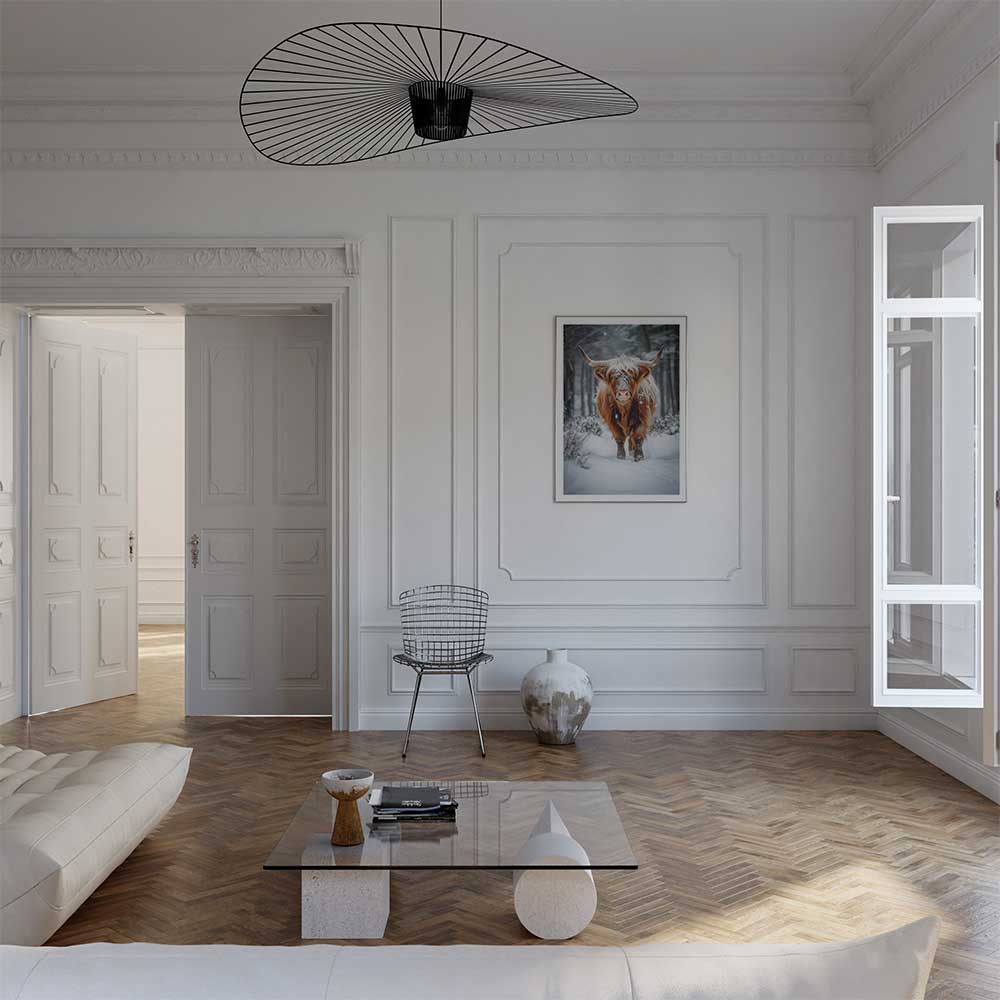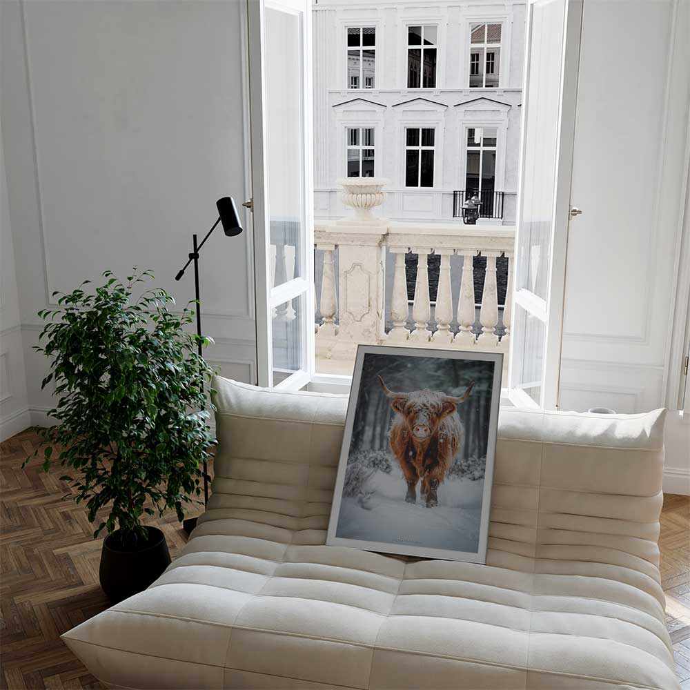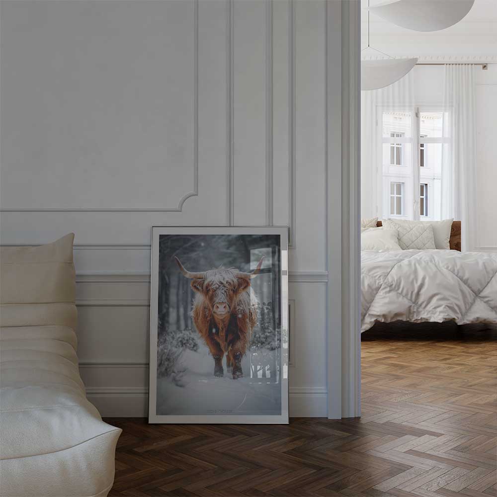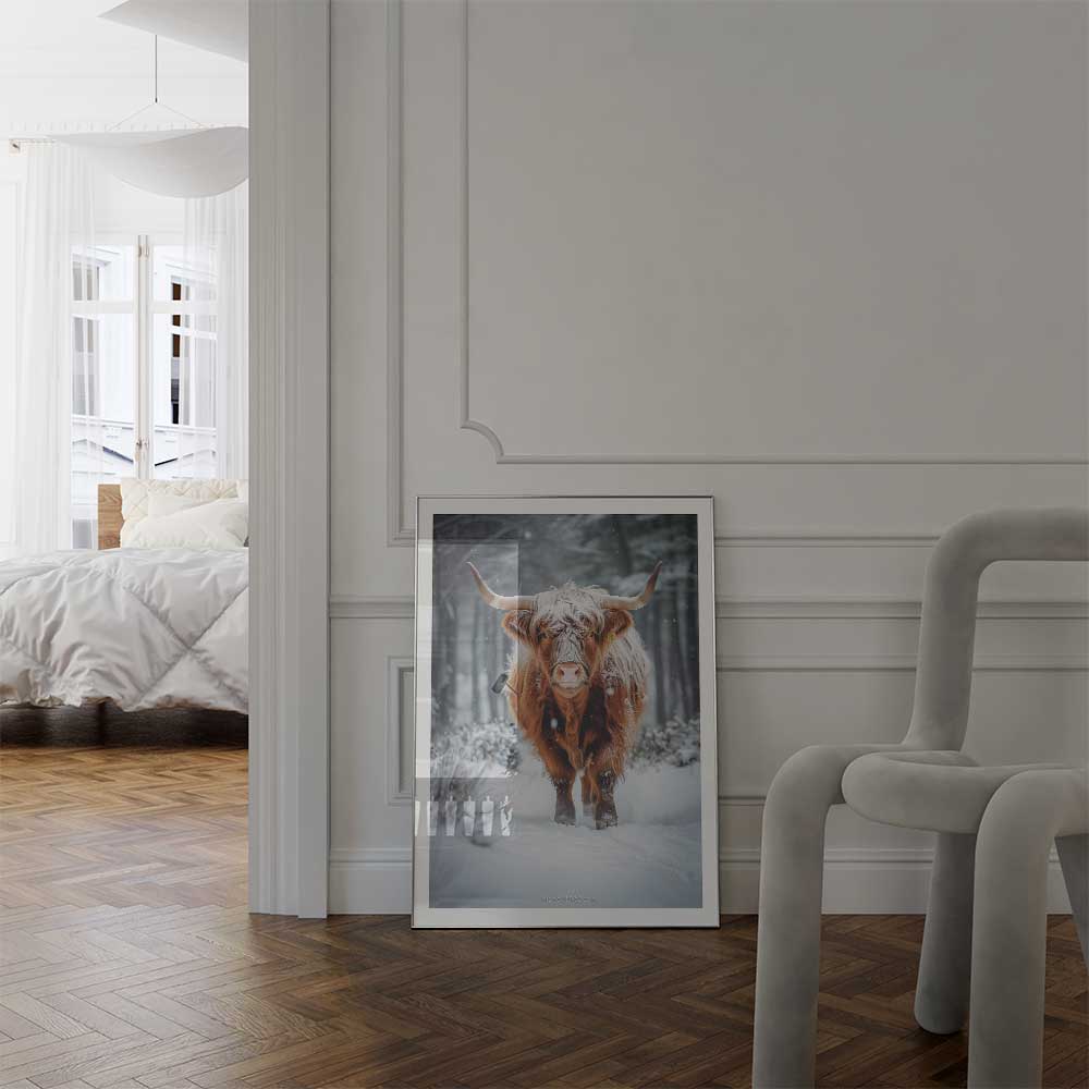 Immerse yourself in the rugged charm of the Scottish Highlands with this striking wall print of a Highland cow, wandering through a snow-covered clearing.