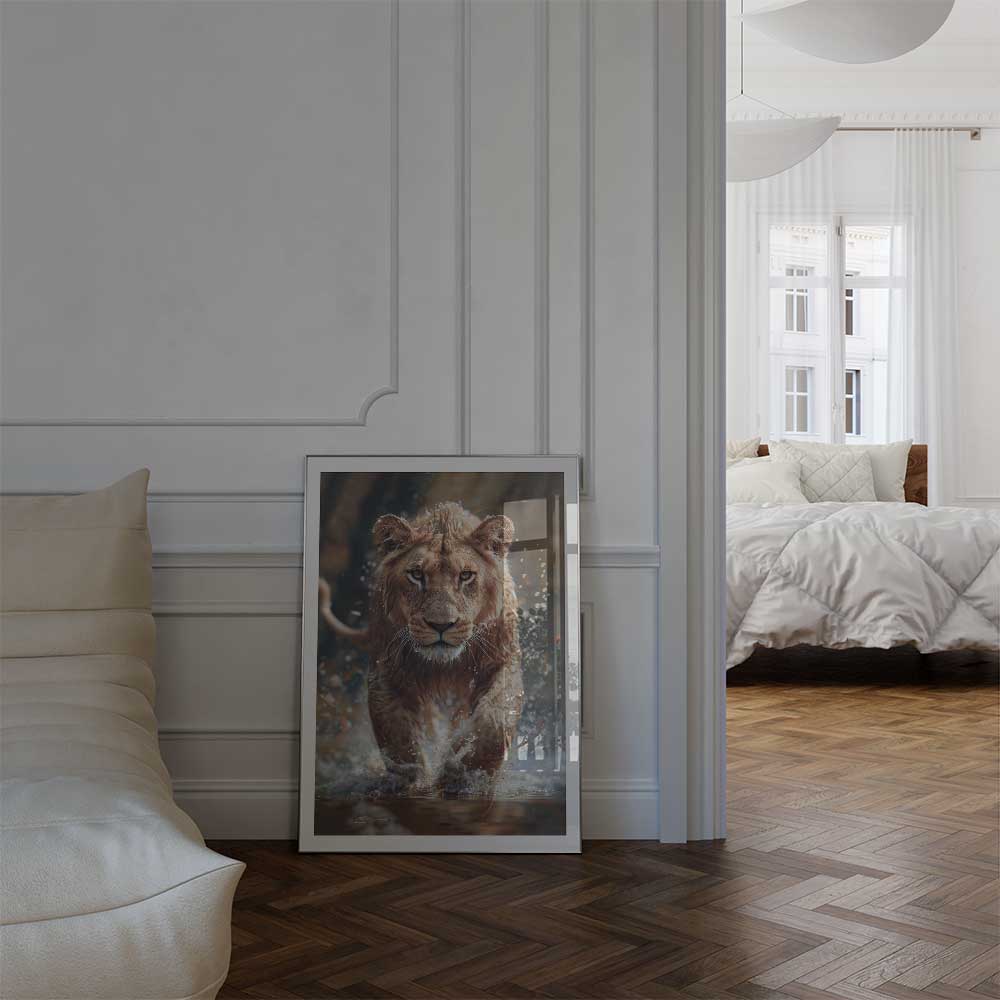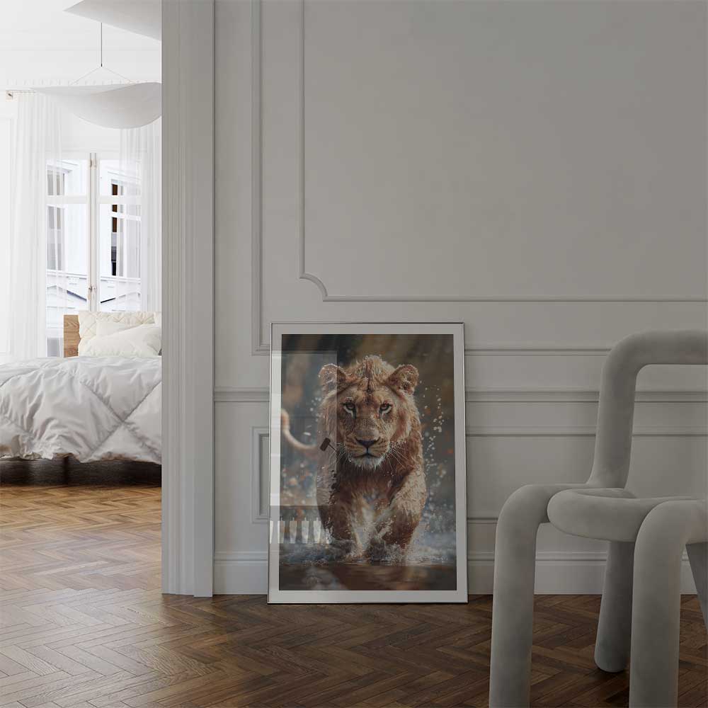 Feel the raw power of the African wilderness with this dynamic portrait of a lion charging through a river, its fierce energy captured as water splashes around it. This striking image embodies strength, determination, and the untamed spirit of the king of the savanna.