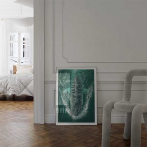 Witness the captivating presence of a tiger shark from above with this stunning aerial view, showcasing its distinctive stripes as it glides through the pristine waters below. This artwork highlights the quiet power and natural beauty of one of the ocean’s most fascinating predators.
